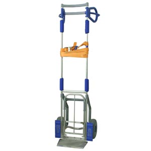 Höggodskärra för tungt gods. Klarar vikter upp till 300kg. Med spännband för fixering av godset.
