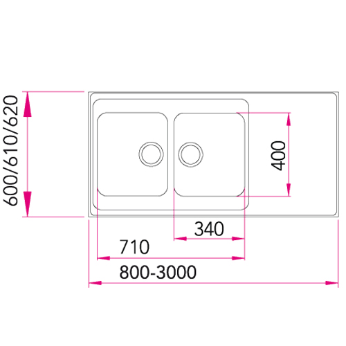 Vändbar diskbänk med slät yta och upphöjd kantprofil. Djup = 610 mm, tjocklek = 30 mm, hodjup=180 mm.