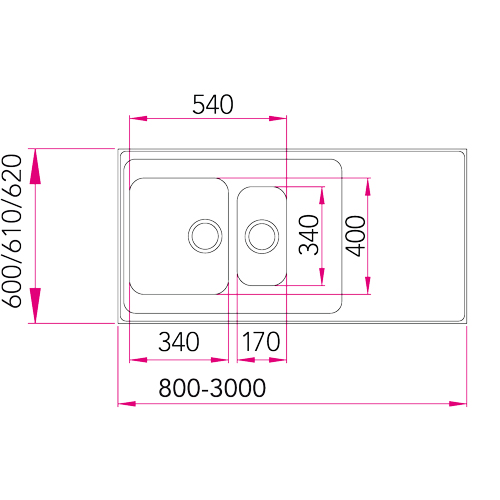 Vändbar diskbänk med slät yta och upphöjd kantprofil. Djup = 610 mm, tjocklek = 30 mm, hodjup=180 mm.