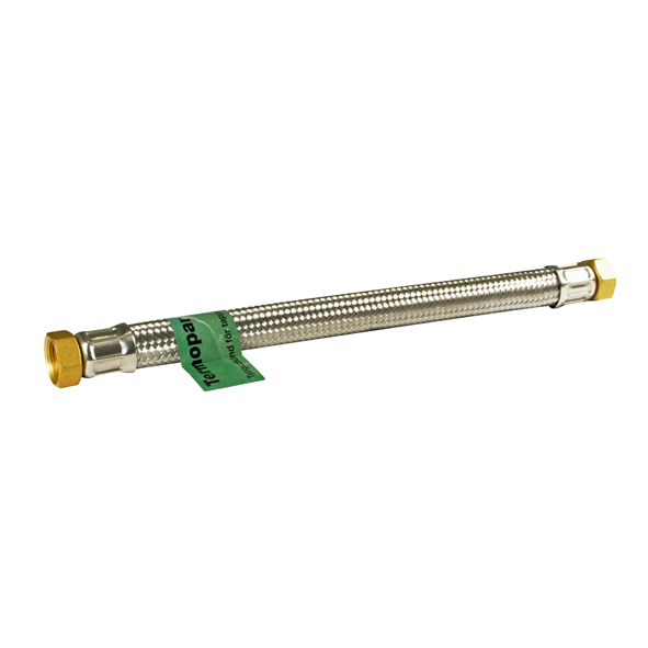 Anslutningsslang i silikon med rostfri omflätning. Anslutning i avzinkad mässing, löpande mutter med inv.gg. För tappvatteninstallationer. Max arb. tryck PN 10. Arbetstemp -5 till +90 C.