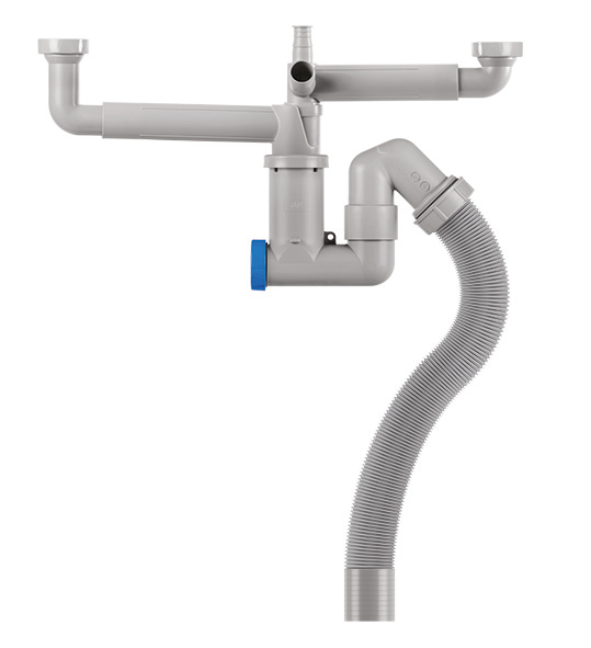 Diskbänkvattenlås med slang för dubbellåda. Ansl. R40, rör Ø 50.