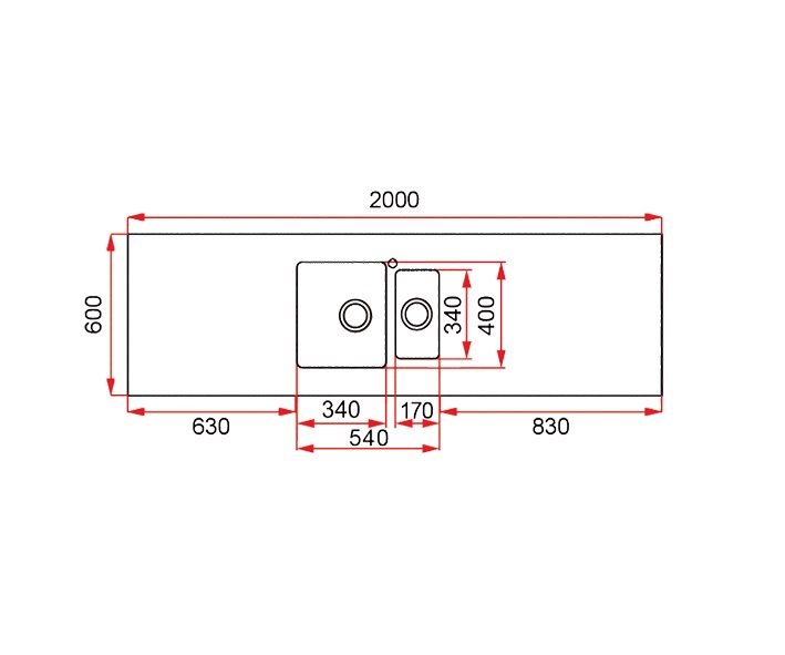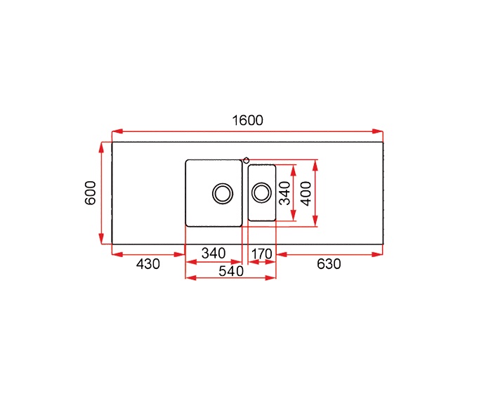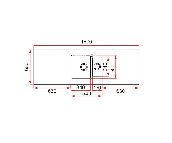 Diskbänk med slät yta, upphöjd kantprofil och förstärkt blandarhål. Djup = 600 mm, tjocklek = 30 mm, hodjup = 180 mm.