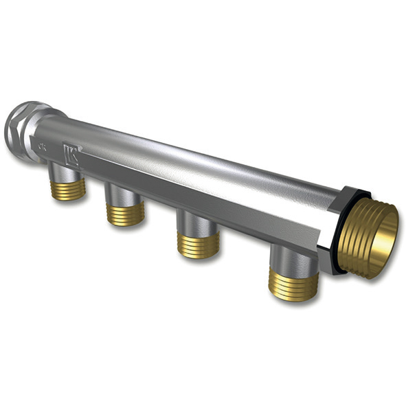 I förnicklad avzinkningsbest. mässing, påbyggnadsbar för värme och tappvattensystem. R20 ut- och inv.gg i ändarna samt avstick 50 mm c/c med utv.gg. Rör ansluts på avstick med anslutningskoppling alt. pressanslutningskoppling. 20-rör som ansluts på avstick R15 dock endast med pressanslutningskoppling.